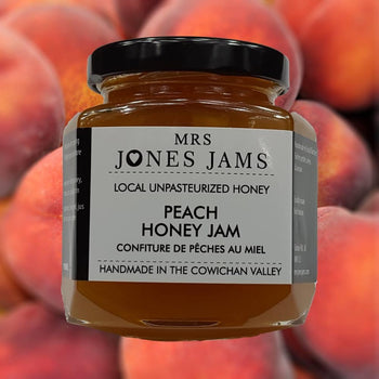 Fresh Okanagan peaches combine beautifully with local unpasteurized honey. Savour the sweetness of this artisan jam with fresh croissants or French bread! INGREDIENTS: peaches, sugar, honey, lemon juice & pectin. Mrs Jones Jams is a range of natural jams and preserves, all handmade in small batches by Joan Wikkerink and her husband...