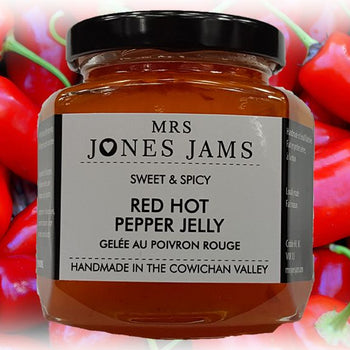 A classic sweet and spicy jelly with red bell peppers and hot chillies. An obvious choice for cheese, but mix with a little hot water and you have a natural sweet chilli dipping sauce or meat glaze. INGREDIENTS: sugar, apple cider vinegar, sweet red peppers, chillies & pectin. Mrs Jones Jams...